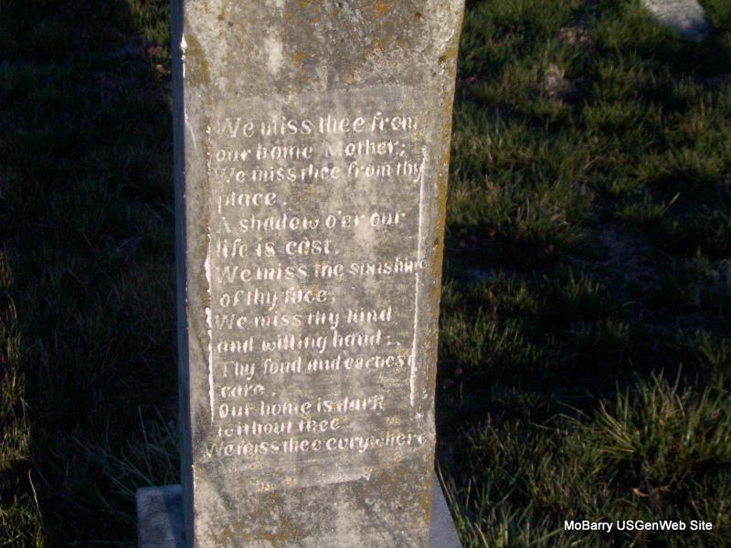 Research Note: Death Certificate information was given by Delmar Walker of Tulsa, OK. Charles Marion Walker was her husband and he died Mar. 17, 1898, but his stone reads 1899. Daughter of Isaiah Thomas Lane and Elizabeth Jane Ray. | Note Donna Cooper Photo Jay Trace |