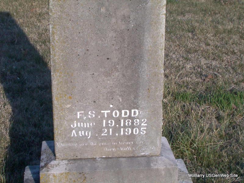 | TODD, F. S. | June 19, 1882 | Aug. 21, 1905 | Inscription: "Blessed Are The Pure In Heart For They Shall See God." | Photo Jay Trace |