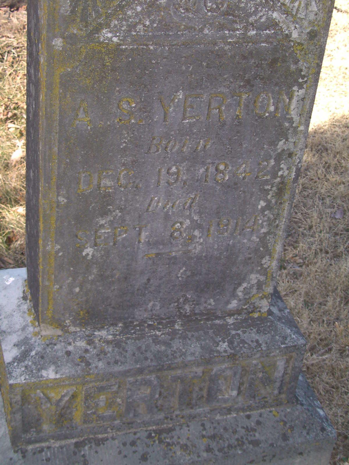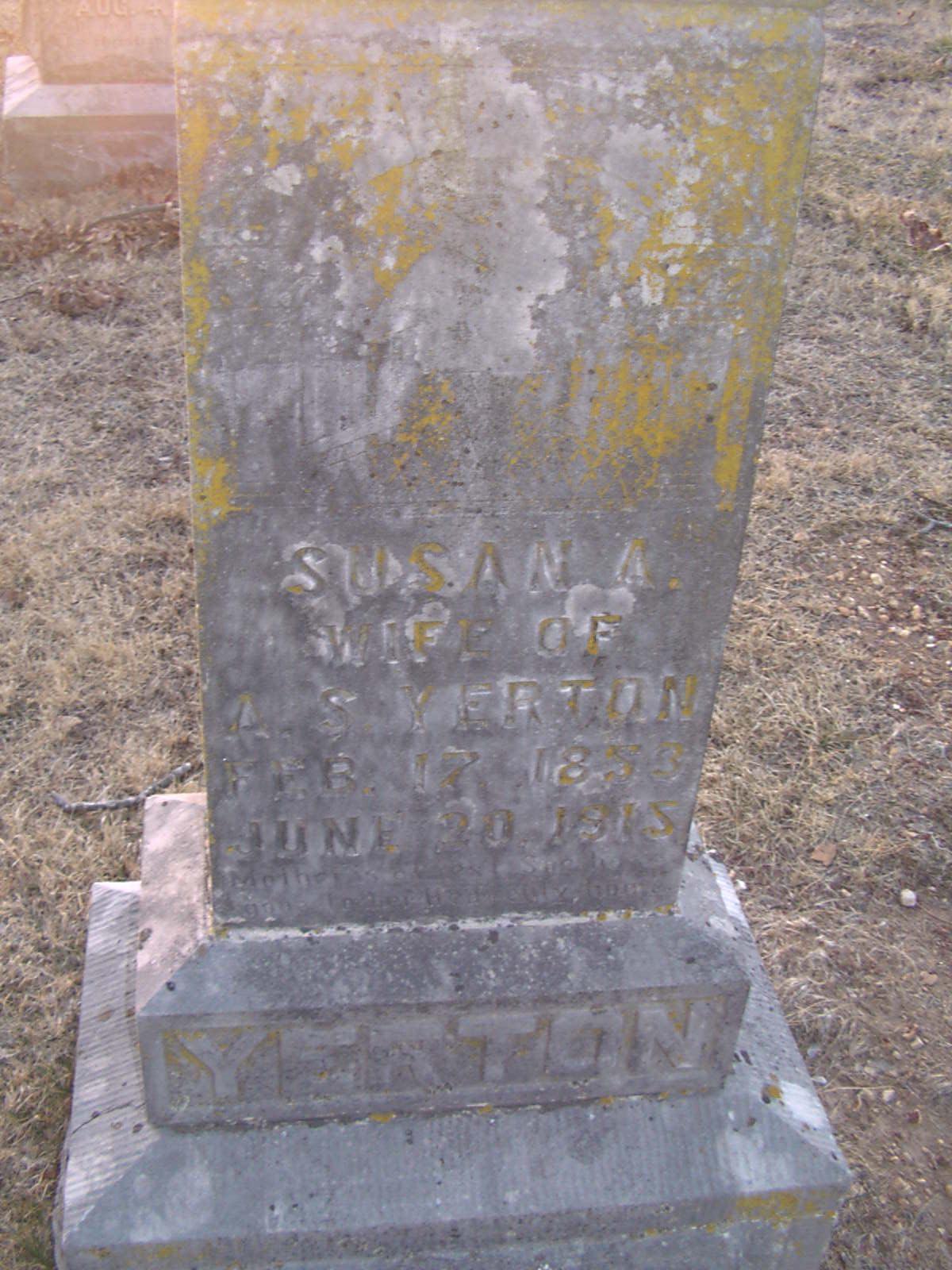 Inscription: "Wife Of A. S." "Mother Is At Rest, Gone To Her Heavenly Home" - Research Note: Death Certificate states her father was John McDunner and her mother Nancy Housewright. They were both born in TN. Cause of death apoplexy. Death Certificate gives date of birth as Feb. 17, 1852, and listed her as a widow. A. E. Yerton gave the information. | Death Certificate Donna Cooper Photo Jay Trace |