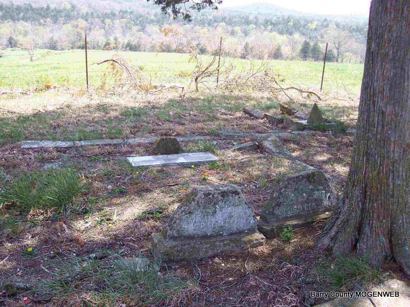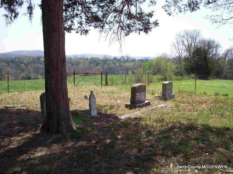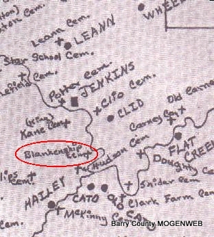 Take 248 out of Cassville about 12 miles, to farm road 1215 turn south, go 1.3 miles to farm road 2120, turn left, go 2 miles to Blankenship driveway, ask at house for permission to go to cemetery. The cemetery is located 1 mile down their driveway. The cemetery can be seen from the driveway.