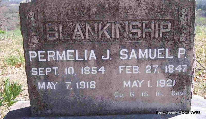 SSW: Permelia J. - Inscription: "Co. G 15 MO Cav." - Research Note: He was widowed, a farmer and parents weren't named on the death certificate. Usual residence was Jenkins, Barry Co., MO. W. W. Bennett of Nevada, MO was the informant. Place of burial was given as Aurora, MO which is incorrect. - Son of Jonathan B. Blankinship and Wilmurth McKinney. - Info provided by a family member at ancestry.com: Samuel P. Blankenship, son of Jonathan Blankenship, was born in West Virginia February 27, 1847. He served during the Civil War in the Union army from 1862-1865 in the 15th Mo. Cavalry in Co. G. Pamela (Permelia) Jane Rogers, his wife, was born September 10, 1843 in Kingston, Arkansas. They were married in 1870. They had a large family - all girls, except two. Jonathan Blankenship drove an ox team and wagon with all their household belongings all the way from West Virginia. | Death Certificate Note Phyllis Long Photo Diana Cope |