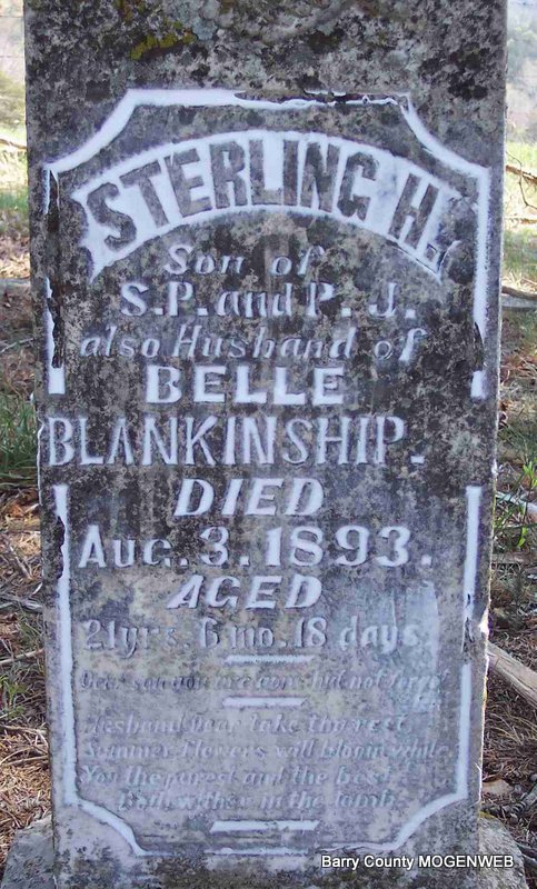 Inscription: "Aged 21 yr. 6 months 18 days" - "Son of S. P. and P. J., Also Husband of Belle" - Research Note: Sterling, age 19, married Isabell "Belle" Boland, age 15, on Jan. 29, 1891 at Flat Creek, Barry Co., MO. Samuel Blankinship, the father of Sterling H. Blankenship and Thomas Wilson, the guardian of Belle Boland, have given their consent for these minors to marry. - Belle second married William Bates. | MO Marriage Records Phyllis Long Photo Diana Cope |