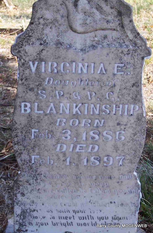 | BLANKINSHIP, Virginia E. | Feb. 3, 1886 | Feb. 1, 1897 | Inscription: "Daughter of S. P. and P. C. Blankinship" - Research Note: Cassville Republican, February 4, 1897 - Died, 12 year old daughter of Mr. and Mrs. Sam Blankenship. Burial was near their former home on Flat Creek. | Online Obit Phyllis Long Photo Diana Cope |