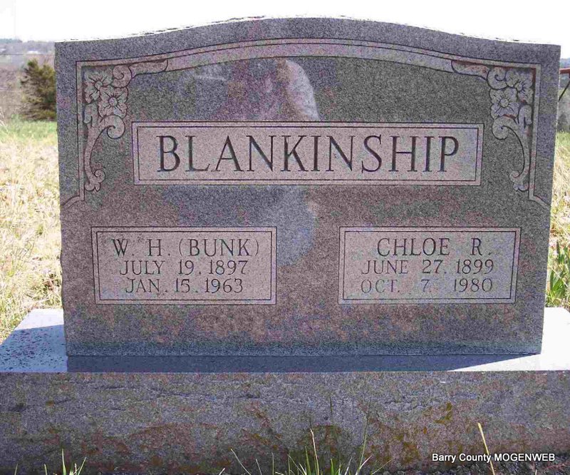 SSW: Chloe R. - Research Note: Son of Samuel Blankinship and Permilia Rogers. Chloe Hudson was his wife and she was the informant on the death certificate. Indexed under BlankEnship. - Cassville Republican, January 17, 1963 - Funeral services for William Henry "Bunk" Blankenship, 65, who died January 15 in the Aurora hospital, will be conducted Thursday afternoon, 2:00 o'clock, in the Clio Community Building. Elder Oliver Coones and Elder Roy Williamson will officiate and burial will be in the Blankenship cemetery near Jenkins under direction of Williamson Chapel in the Valley of Cassville. Mr. Blankenship was a son of the late Samuel and Permilian Blankenship and was born July 19, 1897, near Cassville. He spent his entire life in Barry County except for three years that he lived with his parents in Guymon Okla. On March 20, 1916, he was married to Miss Chloe Hudson of Jenkins and they spent their married life on the same farm near Jenkins. They were the parents of four children. Besides farming and stock raising he taught singing schools over all Barry County and adjoining counties. Surviving in addition to his wife and children are four sisters, Mrs. Annie Blankenship of Yale, Okla.; Mrs. Maggie Lee of Modesto, Calif.; Mrs. Phala Bell of Kernville, Calif.; and Mrs. Vada Phillips of Jenkins and 15 grandchildren. | Online Obit Death Certificate Phyllis Long Photo Diana Cope |