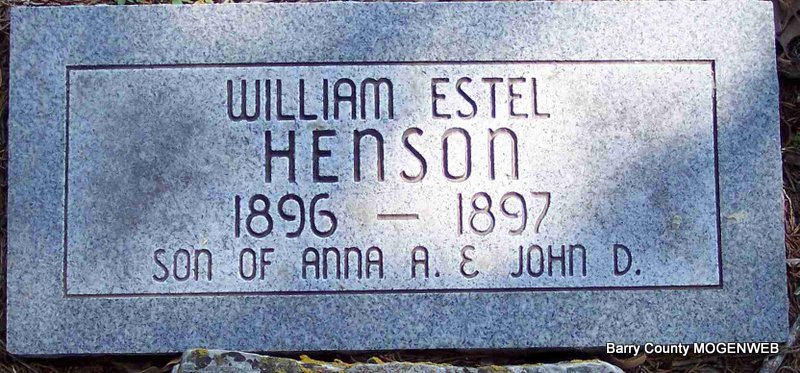 | HENSON, William Estel | 1896 | 1897 | Inscription: "Son of Anna A. and John D." | Photo Diana Cope |