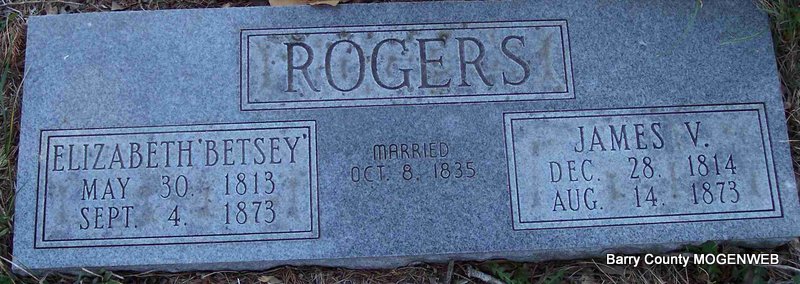 SSW: Elizabeth "Betsey" - Inscription: "Married Oct. 8, 1835" - Research Note: Son of John B. Rogers and Agnes Penquite (Vance) Rogers. - Info provided by a family member at ancestry.com: James Vance Rogers was born in Tennessee in 1810. His wife, Elizabeth (Burks) Rogers was born in Tennessee in 1813. Ten children were born in Tennessee, Iowa and Arkansas. James Vance Rogers was a slave holder. He once bought a one-year-old baby, and as he rode away with it, the cries of the mother caused him to go back and give her the baby. He then went home and turned all his slaves free. They refused to leaved him, and he permitted them to stay with pay. | Note Phyllis Long Photo Diana Cope |