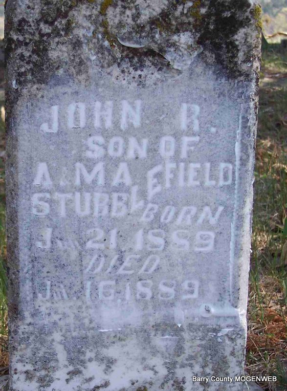 | STUBBLEFIELD, John R. | June 21, 1889 | July 16, 1889 | Inscription: "Son of A. and M.A." | Photo Diana Cope |