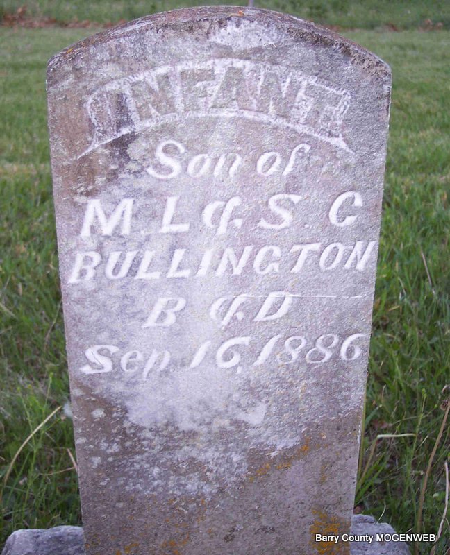 | BULLINGTON, Oscar Alonzo | Sept. 14, 1884 | Aug. 12, 1885 | Inscription: "Son of M. L. and S. C. Bullington - Aged 10 MO, 25 DS " - Research Note: Son of Marcus L. Bullington and Sarah Call. | Note Phyllis Long Photo Diana Cope |
