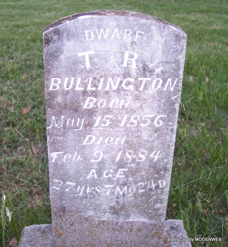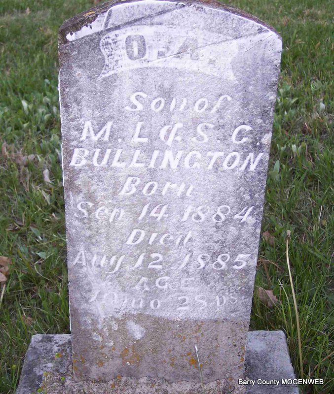 Inscription: "Dwarf - Aged 27 yrs, 7 M, 24 D" - Research Note: Son of William J. Bullington and Mary Anderson. Living with his brother in 1880. - 1880 Census, McDonald, Barry, Missouri - Mark L. Bullington, age 26, farmer, born AR; Sarah C., wife, age 27, born AR; Etta May, age 1, daughter, born MO; Tire R., brother, age 26, born AR; Peter B., brother, age 13, born MO; Mary A., sister, age 10, born MO; James R., brother, age 8, born MO. | Census Phyllis Long Photo Diana Cope |