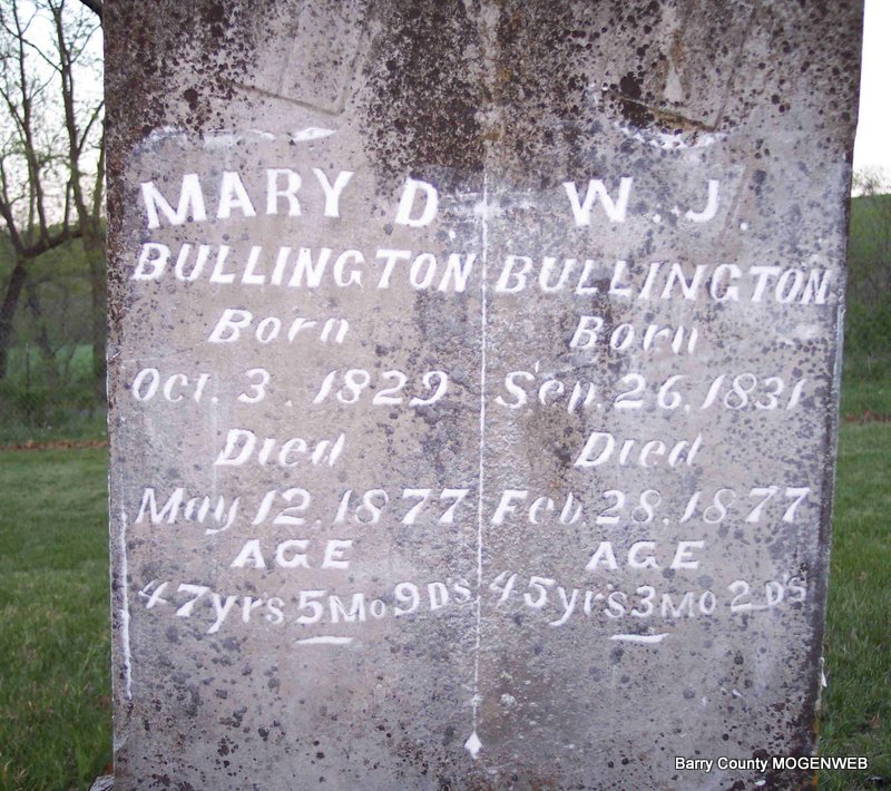 SSW: Mary D. Bullington - Inscription: "45 yrs 3 mos., 2 dys" - Research Note: Supposedly the son of Henry Tyre Bullington and Elizabeth C. Howard. - 1860 Census, Prairie, Carroll, Arkansas - William J. Bullington, age 27, farmer, born TN; Mary, age 30, born TN; Gideon W., age 7, born TN; Marcus S., age 6, born AR; Tyre R., age 4, born AR; Sarah F., age 1, born AR. - 1870 Census, McDonald, Barry, Missouri - William Bullington, age 39, farmer, born TN; Mary, age 43, born TN; Leroy, age 16, born AR; Tira, male, age 13, born AR; Sarah, age 9, born AR; John, age 8, born AR; Burris, age 4, born MO; Alice, age 1, born MO. - | Census Phyllis Long Headstone Darla Marbut Photo Diana Cope |