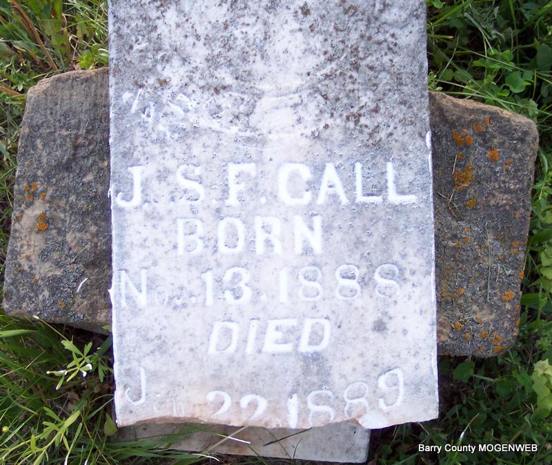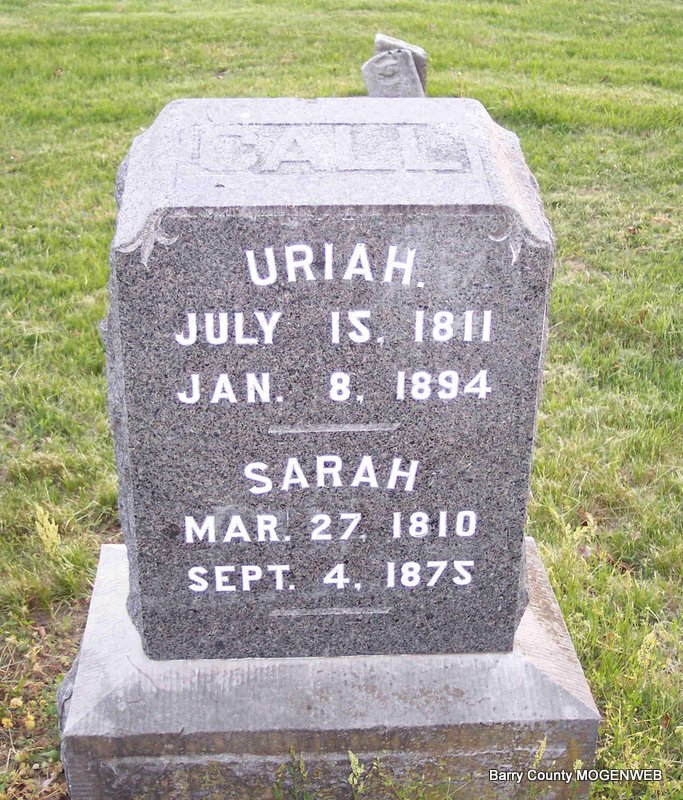 SSW: Sarah Call - Research Note: Supposedly the son of William Call and Eleanor Nellie King. First wife was Sarah Cox. Uriah Call second married Caroline Blalock on Sept. 25, 1879 in Barry Co., MO. - 1850 Census, Carrollton, Carroll, Arkansas - Uriah Call, age 39, born SC; Sarah, age 37, born TN; Susan Jane, age 14, born TN; Nancy, age 12, born TN; William C., age 9, born TN; Mary C., age 7, born IL; Nicholas, age 2, born AR. - 1870 Census, McDonald, Barry, Missouri - Uriah Call, age 60; Sarah, age 57; James, age 14. - 1880 Census, McDonald, Barry, Missouri - Uriah Call, age 66, farmer, born SC, father born England, mother NC; Caroline, age 52, wife, born TN; Parents born TN; Lulu McKinna, age 8, servant, born MO, parents born TN. | MO Marriage Records Census Phyllis Long Headstone Darla Marbut Photo Diana Cope |