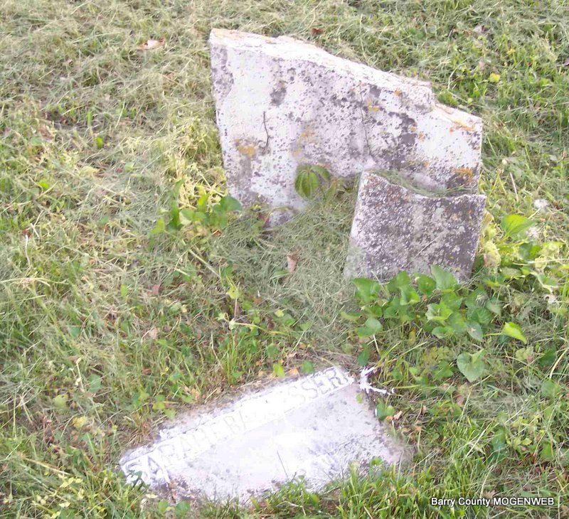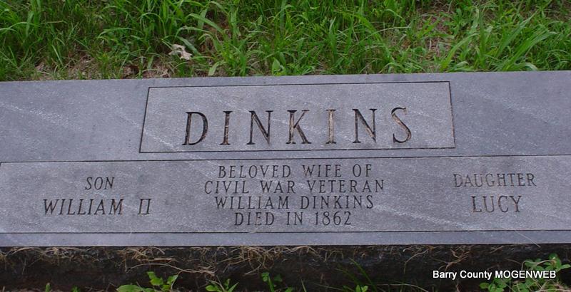 | DINKINS, Rebecca | No Date | No Date | Inscription: "Beloved wife of William Dinkins, Civil War Veteran. Children Lucy and William II - Died in 1862" - Research Note: This is the grave of Rebecca Dinkins, mother of Sarah Agnes Dinkins who married John Riggs in 1871 in Barry Co. The information on the headstone stating that Rebecca Dinkins was the wife of William Dinkins is probably incorrect. Her husband was Henry Dinkins who died in the Civil War in 1863. I believe that Henry had a brother named William, but William died before 1860 so he could not have been killed in the war - the family group migrated from Kentucky to Reynolds Co., MO, and then some of them came to Barry County after 1860. Henry and Rebecca did have children named Lucy and William as the headstone states. | Note Anita Tally Photo Diana Cope |