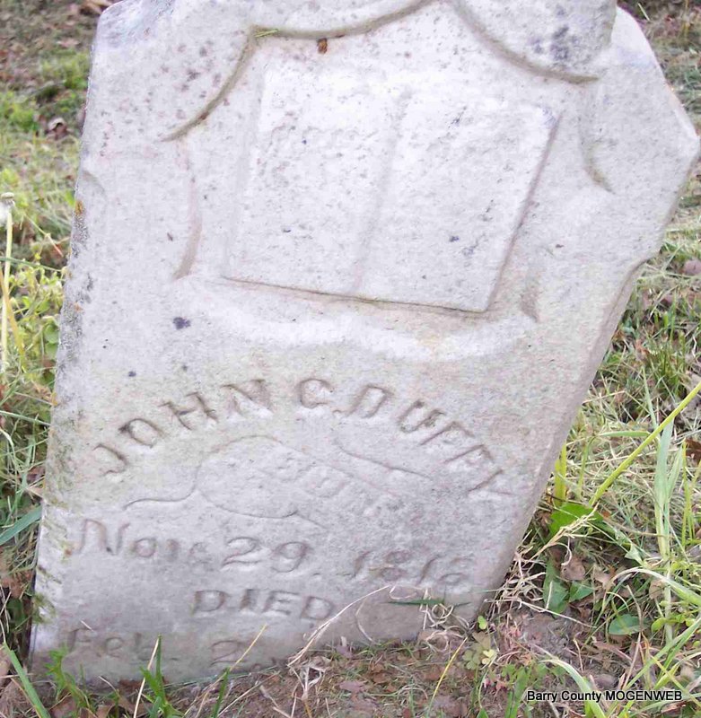 | HENLEY, Martha Belle (DUFFY) | Apr. 5, 1857 | Sept. 30, 1882 | Inscription: "His Wife" - Research Note: Roland Henley married Martha Isabella Duffey on Nov. 27, 1876 in Barry Co., MO. | MO Marriage Records Phyllis Long Photo Diana Cope |