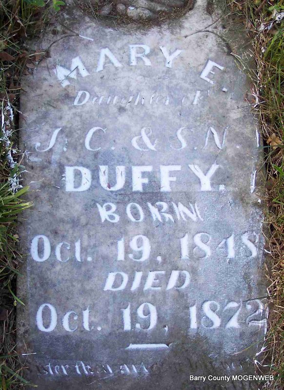 | DUFFY, Mary E. | Oct. 19, 1848 | Oct. 19, 1872 | Inscription: "Dau. of J. C. and S. N." | Photo Diana Cope |