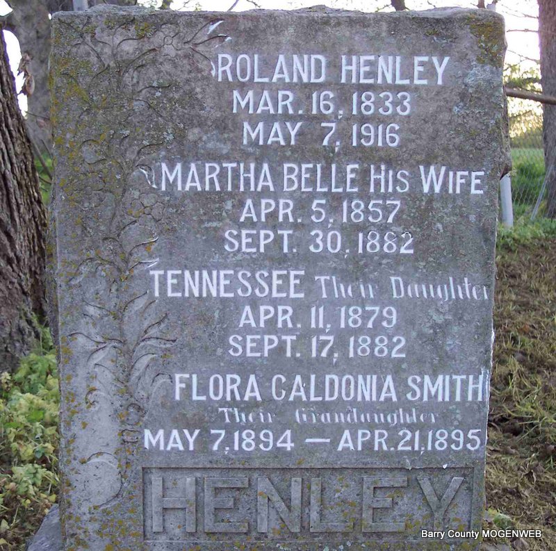 | HENLEY, Tennessee | Apr. 11, 1879 | Sept. 17, 1882 | SSW: Roland, Martha Belle and Flora Caldonia - Inscription: "Their Daughter" - Research Note: 1880 Census, - Roland Henley, age 47, farmer, born TN, father born NC, mother KY; Martha, wife, age 23, born IN, parents born OH; Louisa, daughter, age 2, born MO; Tennessee, daughter, age 10 months, born MO; Elizabeth, sister, age 36, born TN. | Census Phyllis Long Photo Diana Cope |