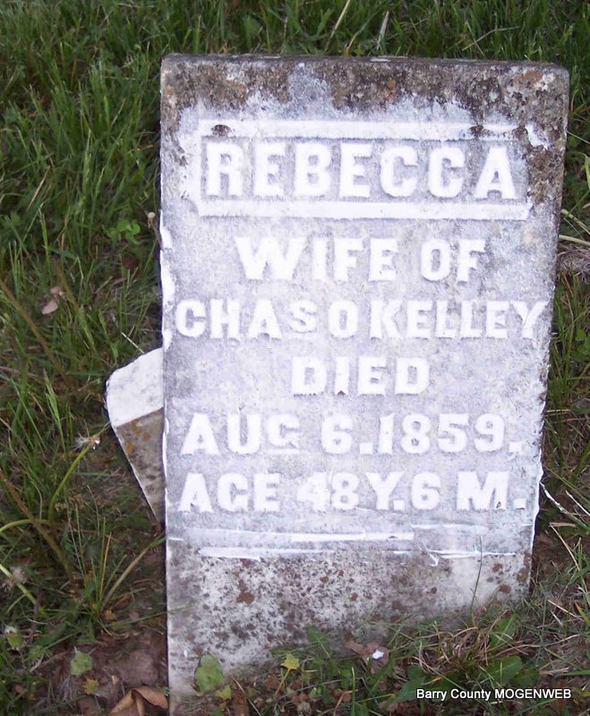 | O'KELLEY, Rebecca | Abt. 1811 | Aug. 6, 1859 | Inscription: "Wife of Charles O'Kelley - Aged 48 Y - 6 M" - Research Note: US and International Marriage Records - Charles O'Kelley, born TN, married Rebecca (no surname given), born GA, no date. - Other researchers say she was Rebecca Fitzgerald, daughter of Samuel Fitzgerald and Nancy Dollar. - 1850 Census, District 5, Barry, Missouri - Charles O'Kelley, age 39, blacksmith, born TN; Rebecca, age 38, born GA; Elizabeth, age 17, born TN; James, age 13, born TN; Francis, age 10, born TN; Charles, age 7, born MO; Sarah, age 5, born MO; Mary, age 1, born TX. | Census Phyllis Long Photo Diana Cope |