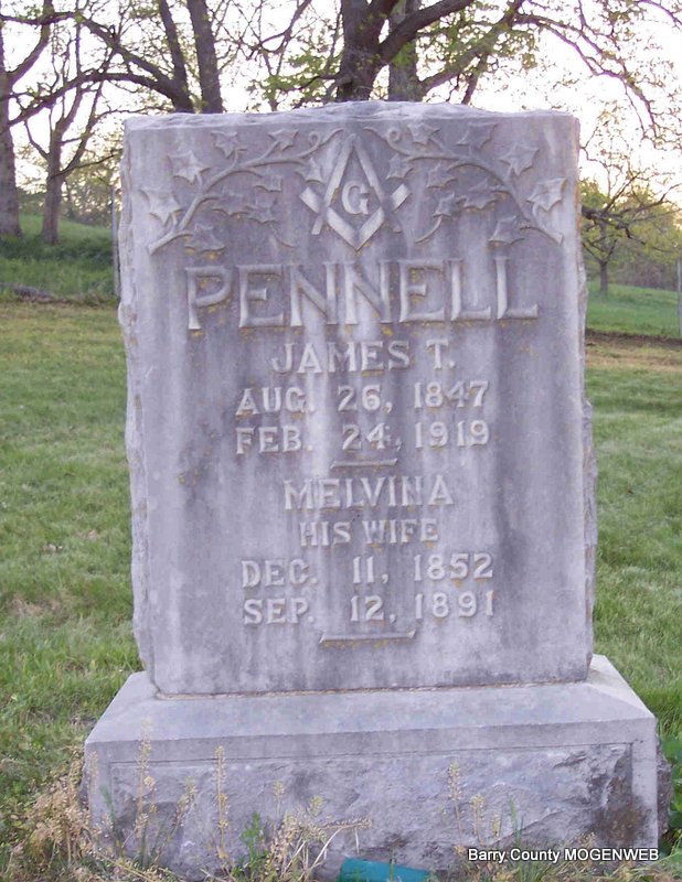 SSW: Melvina - Research Note: Cassville Republican, February 27, 1919 - James T. Pennel who for the past half century has been a citizen of the Gunter locality, died at his home Monday afternoon, February 24, at the age of 72 years. Last September Mr. Pennel was stricken with paralysis and failed to recover his former health. He had been seriously ill for many weeks of kidney and a complication of troubles. The funeral was held Tuesday afternoon, conducted by Rev. J. W. Ennes, and the body laid to rest in the Bullington cemetery. The Masonic service was also used as he was a member of the Masonic Lodge. James T. Pennel was a native of Tennessee, having been born in that state in August 1846. His parents moved to this county before the Civil war. During the war James T. served in the Union army and was in the Battles of Wilson Creek and Prairie Grove. After the war closed he located on Gunter and lived there the remainder of his life. He leaves three sons, S. S., J. H. and W. H. Pennel and one daughter, Mrs. Granville Terry. He was one of this county's best citizens and will be greatly missed in the community where he has lived so long. - March 6, 1919, Cassville Republican - Gunter: James Pennel died the 24th of February and his body laid to rest in the Roller Cemetery the 25th, Bro. Francis Goodnight conducted funeral services. Bro. Ennes not able to attend. - His obit reads that he was born August 1846. - Son of Perry Pennell and Jane Willmoth. | Online Newspapers Donna Cooper Census Online Newspapers Phyllis Long Photo Diana Cope |