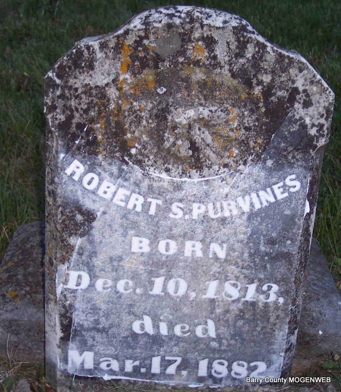 | PURVINES, Robert S. | Dec. 10, 1813 | Mar. 17, 1882 | Research Note: Listed in 1880 Census of Barry Co., MO, Shoal Creek Twp. - Robert S. Purvines, Self, Married, Male, White, 66, TN, Farmer, NC, NC; Ursula Purvines, Wife, Married, Female, White, 66, TN, Keeping House, VA, VA; James H. Purvines, Son, S, Male, White, 24, MO, Farmer, TN, TN. | Census Donna Cooper Photo Diana Cope |