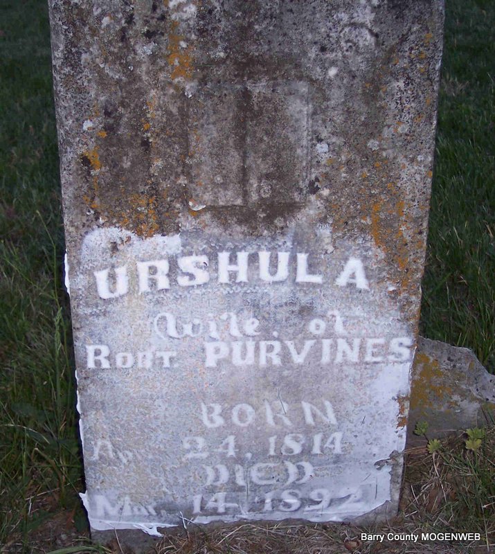 | PURVINES, Ursula A. (THORNHILL) | Apr. 24, 1814 | Mar. 14, 1892 | Inscription: "Wife of Robert" - Research Note: Daughter of Armstead Thornhill and Rachel Johnson. - 1860 Census, McDowell, Barry, Missouri - Robert Purvines, age 46; Ursula, age 46; Martha, age 13; Rachel, age 11, Nancy, age 7; James, age 5; Rachel Thornhill, age 74 (Ursula's mother). | Census Phyllis Long Photo Diana Cope |