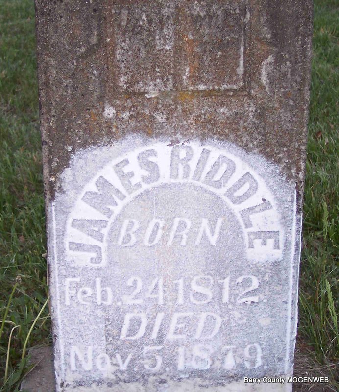 | RIDDLE, Rhoda (KING) | Abt. 1813 | Nov. 25, 1879 | Research Note: She is listed in Barry County Pioneers and Beyond on page 705 as being buried in Bullington with an approximated birth date of 1815. Other posts on the Internet have her born about 1813. She married James Riddle in Rhea County, TN, July 13, 1833. | TN Marriage Records Donna Cooper |