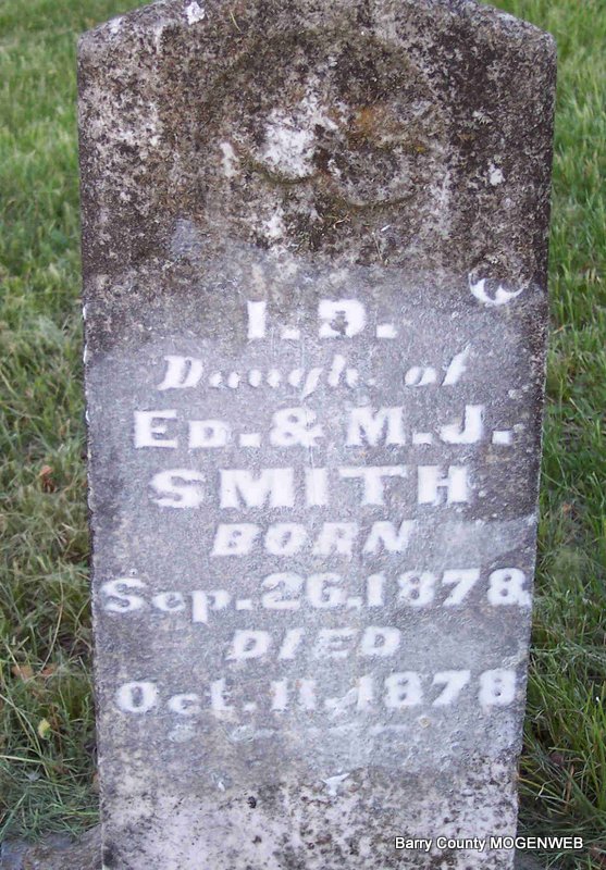 | SMITH, I. D. | Sept. 26, 1878 | Oct. 11, 1878 | Inscription: Dau. of Ed and M. J. Smith" - Research Note: Probably the daughter of Edward Smith and Martha Jane Linn. Granddaughter of Thomas and Malinda Smith. | Census Phyllis Long Photo Diana Cope |