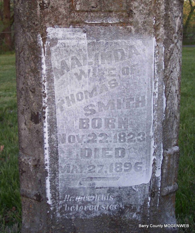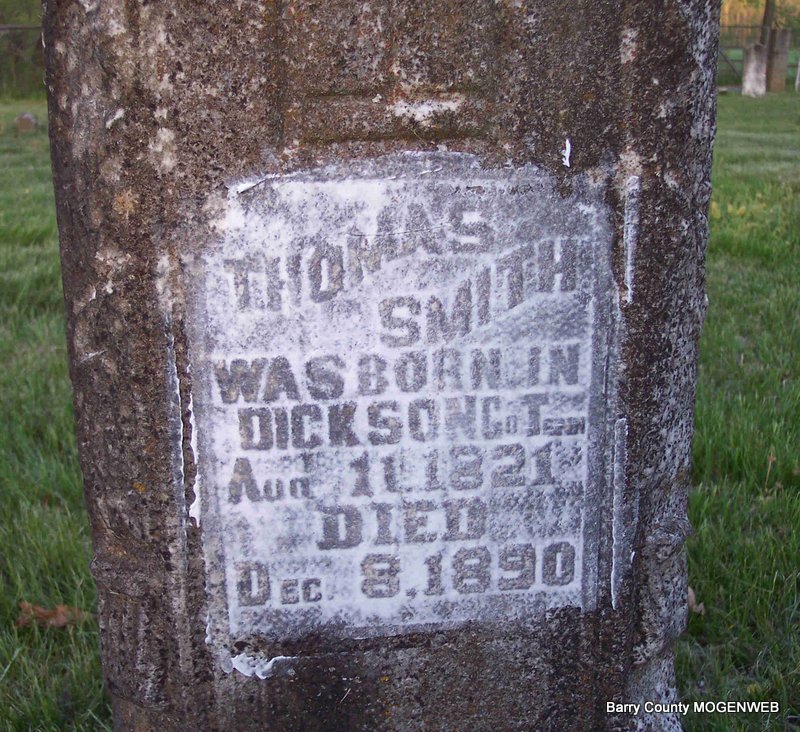 Inscription: "Thomas Smith was born in Dickson Co., Tenn." - Research Note: 1860 Census, McDowell, Barry, Missouri - Thomas Smith, age 38, farmer, born TN; Malinda, age 36, born TN; Edward, age 11, born TN; Thomas, age 11, born TN; John, age 9, born TN; Malinda, age 11 months, born MO. - 1870 Census, McDonald, Barry, Missouri - Thomas Smith, age 49, born TN; Melinda, age 47, born TN; Melinda, age 10, born MO; Durinda, age 4, born MO; Thomas, age 21, born TN; Millie Medlock, age 38, born MO; Mary E. Medlock, age 12, born MO; William Medlock, age 10, born MO. | Photo Diana Cope |