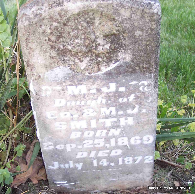| SMITH, P. M. J. | Sept. 25, 1869 | July 14, 1872 | Inscription: Dau. of Ed and M. J. Smith" - Research Note: Probably the daughter of Edward Smith and Martha Jane Linn. Granddaughter of Thomas and Malinda Smith. | Census Phyllis Long Photo Diana Cope |