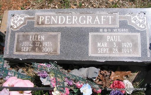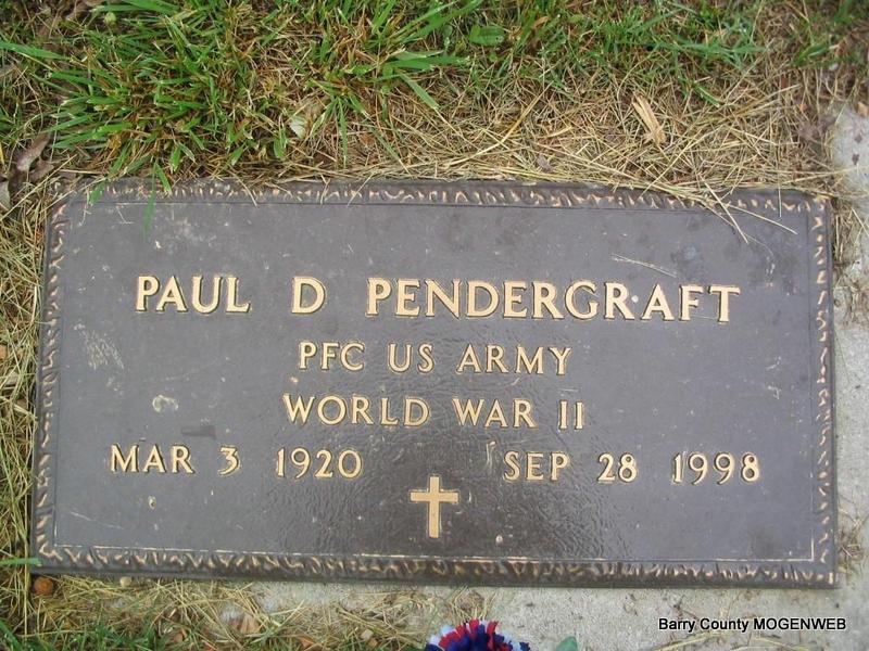 | PENDERGRAFT, Paul Dewain | Mar. 3, 1920 | Sept. 29, 1998 | SSW: Ellen - Inscription: "WW II Veteran" - Research Note: He was buried Oct 2, 1998. Services were at Fohn Funeral Home in Cassville, Missouri. He is a brother of Ruby (Pendergraft) Ruark. Son of John Thomas Pendergraft and Laura Cassie Fletcher. - Military Stone - Inscription: "PFC US ARMY WORLD WAR II" | Family Files Obit Beverly Matthews Photo Phyllis Long |