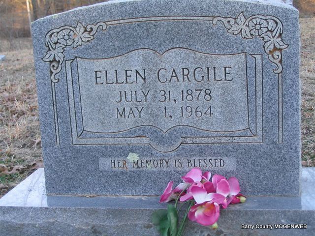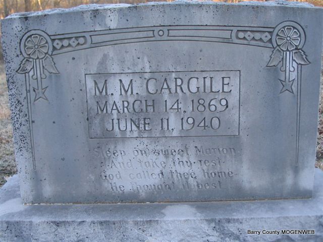 Inscription: "Asleep On Sweet Marion and Take Thy Rest God Called Thee Home, He Thought It Best" - Research Note: Marion Monroe Cargile was the husband of Sarah Ellen Pendergraft, and a son of James Thomas and Mary Susan (Oakley) Cargile. - 1910 Census, Ash Twp., Barry Co., MO - Marion M. Cargile, head, age 41, married 14 years, born MO, father born MO, mother TN, farmer; Ellen, wife, age 31, married 14 years, mother of 1 child, living, born MO, parents born MO; Lonnie, son, age 13, born MO. - Cassville Republican, March 5, 1896 - Licensed to Wed: Marion M. Cargile, 26, Washburn and Ellen Pendergraft, 17, Washburn. - MO Marriage Records - Cargile, Marion M., age 26, married Pendergraft, Ellen, age 17, on Mar. 1, 1896 in Barry Co., MO. | Headstone Mary Homesley Family Files Census Death Certificate Online Newspapers MO Marriage Records Photo Phyllis Long |