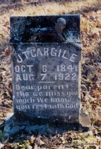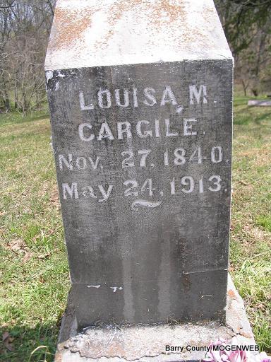Inscription: "Dear Parent Tho We Miss You Much We Know You Rest With God" - Research Note: Son of John and Emeline (Eubank) Cargile. He first married Mary Susan Oakley. Second wife was Louisa May Baker. Third married Sadie Belle Shaw. - 1850 Census, Barry Co., MO - Cargile, John 35 (m) TN; Emeline 35 (f) VA; James 7 (m) MO; Nancy 5 (f) MO; Sarah 4 (f) MO; Mary 2 (f) MO. - Another Photo - Cargile Family History | Headstone Mary Homesley Death Certificate Census MO Marriage Records Photo Phyllis Long |