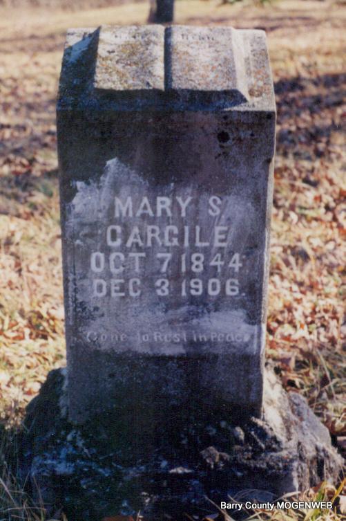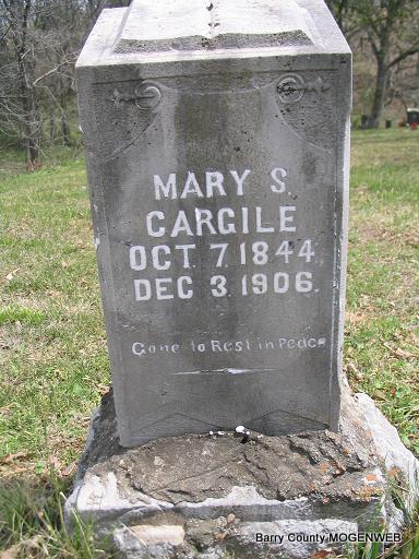 Inscription: "Gone To Rest In Peace" - Research Note: First wife of James Thomas Cargile, daughter of Benjamin and Mary (Meyers) Oakley. - Cassville Republican, Dec. 6, 1906 - Mrs. James Cargile died at her home near Big Springs Sunday night and was buried Monday at the family cemetery near Washburn.- Another Photo | Headstone Mary Homesley Family Files Online Newspapers Photo Phyllis Long |