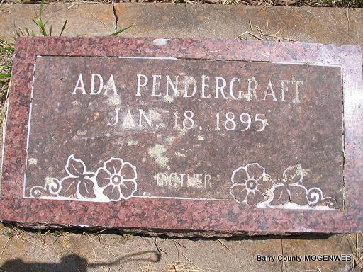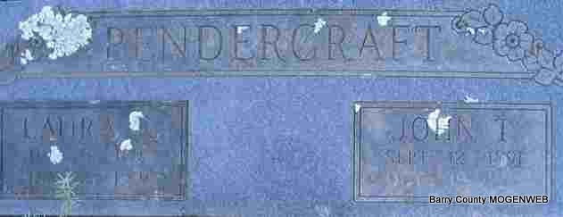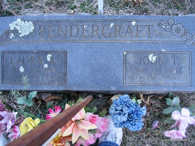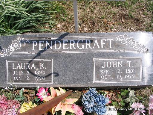 | PENDERGRAFT, John Thomas | Sept. 12, 1891 | Oct. 19, 1979 | SSW: Laura K. - Research Note: John Thomas Pendergraft was a son of James Polk and Lavina (Gilliland) Pendergraft. His wife was Laura Kathleen "Cassie" Fletcher. - 1920 Census, Mountain, McDonald Co., MO - Tom, head, age 28, born AR, father born AR, mother MO, owns saw mill; Cassie, wife, age 24, born MO; Ruby, daughter, age 5, born MO; James, son, age 2 and 8 months, born MO. - Computer Enhanced Negative - Another Photo | Headstone Mary Homesley Family Records Ruby Snow Photo Phyllis Long |