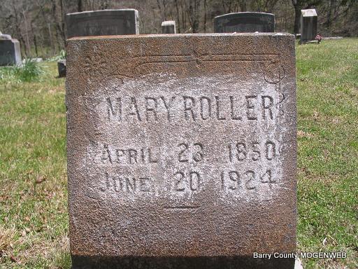 Research Note: Her death certificate reads that her birth date was Mar. 7, 1850, the stone has Apr. 23, 1850. Mary was a widow, husband not named. She was a daughter of Adam and Polly (Lemons) Gann. Dock Eggleston of Washburn, MO was the informant and undertaker. - Wife of Allen Roller. | Headstone Mary Homesley Death Certificate Census Photo Phyllis Long |