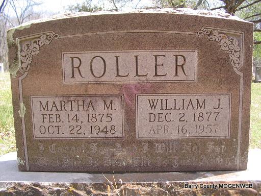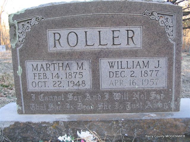| ROLLER, Martha M. (CARGILE) | Feb. 14, 1875 | Oct. 22, 1948 | SSW: William Joseph Roller - Inscription: "I cannot say and I will not say that she is dead. She is just asleep" - Research Note: She was a wife of William J. Roller, and a daughter of James Thomas and Mary Susan (Oakley) Cargile. - William J. Roller, age 21, married Martha M. Cargile, age 25, on Apr. 11, 1899 in Washburn, Barry Co., MO. - 1880 Census, Ash, Barry, Missouri - James T. Cargile, age 38, born MO; Mary S., Wife, age 36, born IN; Francis T., Dau., age 13, born MO; Marion M., son, age 11, born MO; Mary E., Dau., age 9, born MO; Sarah M., Other, age 7, born MO; Martha M., Dau., age 5, born MO - 1930 Census, Barry Co., MO - Joe Roller, head, age 52, married at age 21, born Ark, father born PA, mother MO, farmer; Martha, wife, age 56, married age 25, born MO, parents born MO. - Another Photo | Headstone Mary Homesley Family Files MO Marriage Records Census Photo Phyllis Long |