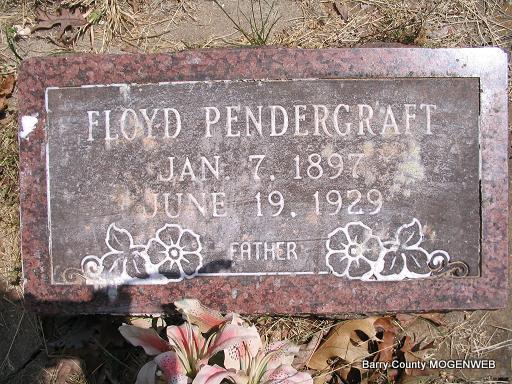 | PENDERGRAFT, Floyd George | Jan. 7, 1897 | June 19, 1929 | Inscription: "Father" - Research Note: Husband of Ada Pendergraft, son of James Polk and Lavina (Gilliland) Pendergraft. - Obit at findagrave.com. - Killed in Saw Mill - Floyd Pendergraft, son of Mr. and Mrs. James Pendergraft, was so badly cut up Monday evening with a saw in a sawmill, just a few miles over in AR where he was working, that he died a few hours later. He was offbearing lumber from the saw when the belt came off. He started to put the belt back on when his arm was caught in the mandell, throwing him over the saw cutting one leg off and sawing the other one almost off and sawing one arm almost off. Floyd was an industrious man and highly esteemed by his friends. He is survived by his wife and one child. After funeral services Thursday afternon, burial was made in the Cargile Cemetery west of Washburn. | Headstone Mary Homesley Obit Photo Phyllis Long |