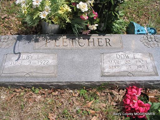 SSW: Ruby L. - Research Note: He was a son of Edward W. "Dutch" Fletcher and his wife Nellie Ann Patton. Dow's wife was Ruby Day. - Obit - Dow E. Fletcher, 70, Washburn, died at 2:20 p.m. March 15, 1994, at St. John's Regional Health Center, Springfield, after an illness. He was a farmer and had served on the Cargile Cemetery Board for several years. His wife, Ruby Day Fletcher, survives. Additional survivors include five sons; seven daughters; a brother Ray Fletcher, Denver, Colo.; five sisters, Faye Fleischman, Aurora, Maxine Morgan, Vancouver, Wash., Velma Rose, Washburn, Verl Ruark, Neosho, and Valerie Adams, Mount Vernon; 33 grandchildren and six great-grandchildren. Services will be at 2 p.m. Friday at Fohn Funeral Home, Cassville, with Rev. John Selleck and Rev. Linear Rose officiating. Burial will be at Cargile Cemetery, southwest of Washburn. | Headstone Mary Homesley Family Files Obit Photo Phyllis Long |