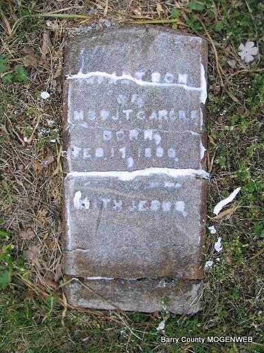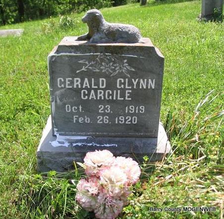 Research Note: May 11, 1911, Cassville Republican - Washburn News: The year old child of John Cargile died Saturday and was buried Sunday afternoon in the Cargile Cemetery, south of town. The twin brother is quite sick at this writing. - Phyllis' Note: Age 1 year 9 days old. Son of John Harbin and Lucretia (Roller) Cargile. His twin, Chester, died in 1998 and is buried at Anderson, MO. No tombstone found. | Online Newspapers Donna Cooper Family Files Photo Phyllis Long |