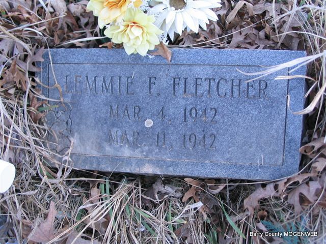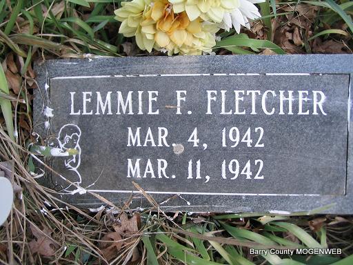 | FLETCHER, Lemmie F. | Mar. 4, 1942 | Mar. 11, 1942 | Research Note: A son of Franklin Conrad and Fannie Ruth (Taylor) Fletcher. - Another Photo | Headstone Mary Homesley Family Files Photo Phyllis Long |
