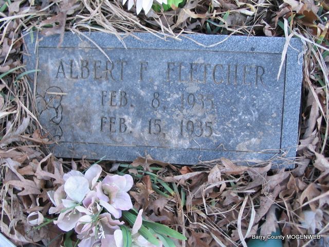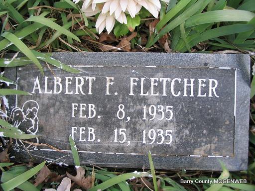 | FLETCHER, Albert F. | Feb. 8, 1935 | Feb. 15, 1935 | Research Note: He was a son of Franklin Conrad and Fannie Ruth (Taylor) Fletcher. - Another Photo | Headstone Mary Homesley Family Files Photo Phyllis Long |