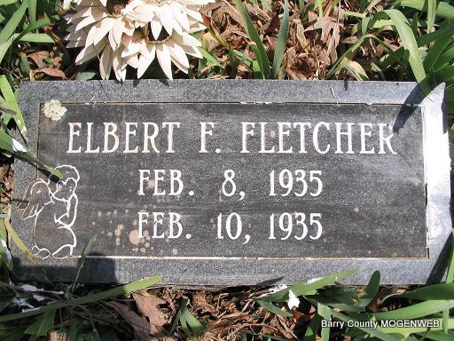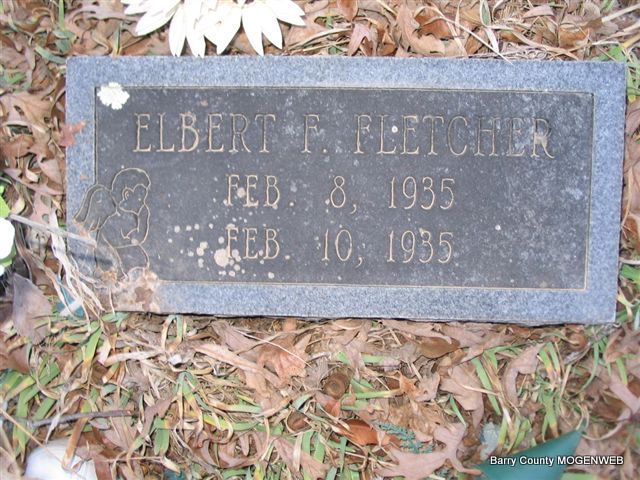 | FLETCHER, Elbert F. | Feb. 8, 1935 | Feb. 10, 1935 | Research Note: He was a son of Franklin Conrad and Fannie Ruth (Taylor) Fletcher. - Another Photo | Headstone Mary Homesley Family Files Photo Phyllis Long |