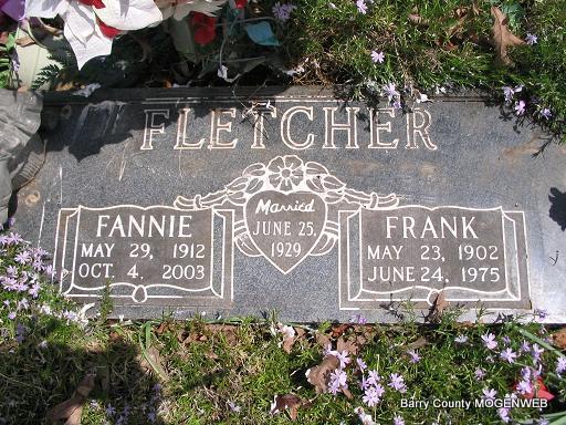 SSW: Frank - Inscription: "Married June 25, 1929" - Research Note: Daughter of Rubin Taylor and Ida Helen Moore. The widow of Frank Fletcher, she was the owner/operator of a saw mill. The informant was her daughter, Freda Suttles. - 1930 Census, Barry Co., MO, District 1 - Frank, head, age 27, married at age 21, born MO, father born WI, mother MO; Fannie, wife, age 17, married at age 17, born MO, parents born MO. - Another Photo | Crafton-Cantrell Funeral Home Connie Schmidt Census Photo Phyllis Long |