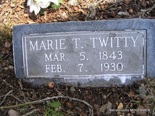 Research Note: Mariah McGough married James K. Twitty, June 30, 1864, Marshall Co., TN. - January 13, 1917, Cassville Democrat - Washburn and Greasy Creek Mixups: W. F. McGaugh and son, A. J. McGaugh of Springdale, Ark., returned home Monday, after visiting his sister Mrs. Twitty on Greasy Creek. - Cassville Republican, Nov. 14, 1918 - Licensed to Wed: A. J. Ford, 77, Garfield, Ark. and M. T. Twitty, 74, Washburn. - 1920 Census, Ash, Barry, Missouri - Andrew J. Ford, head, age 78, born AR, parents born TN, farmer; Maria, wife, age 76, born TN; Jim Twitty, step-son, age 49, born TN; Sara Twitty, (Jim's wife, she was Sarah Laney), age 19, born MO; Maude Twitty, granddaughter, age 8 months, born MO. | Headstone Mary Homesley MO Marriage Records AR Marriage Records Census Online Newspapers Photo Phyllis Long |