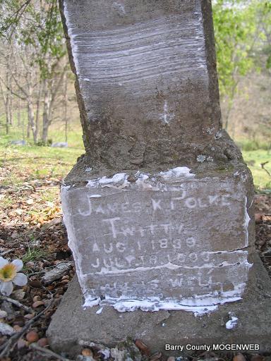 Inscription: "All is Well" - Research Note: Son of Leonard Henley Twitty and Judith L. Hardin. His wife was Mariah Tennessee McGough. - Cassville Republican, August 17, 1893 - Est. J. P. Twitty, dec'd, John L. Banks, Warren Potts and James Cargyle appointed commissioners to set out homestead to M. L. Twitty, widow. [Cargile] - 1880 Census, Colville, Benton, Arkansas - James K. Twitty, age 40, farmer, born TN, parents born TN; Mariah T., age 36, wife, born TN, parents born TN; William H., son, age 11, born TN; James, age 9, son, born TN; Zulah, daughter, age 4, born AR; Judius, age 2, daughter, born AR; Ora E., daughter, age 3 months, born AR. | Headstone Mary Homesley Online Newspapers Census Photo Phyllis Long |