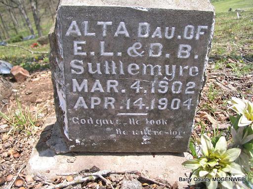 | SUTTLEMYRE, Alta | Mar. 4, 1902 | Apr. 14, 1904 | Inscription: "Dau. of E. L. and D. B. Suttlemyer" | Headstone Mary Homesley Photo Phyllis Long |