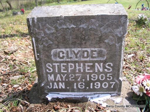 | STEPHENS, Clyde | May 27, 1905 | Jan. 16, 1907 | No Data | Headstone Mary Homesley Photo Phyllis Long |