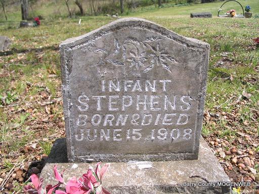 | STEPHENS, Infant | June 15, 1908 | June 15, 1908 | No Data | Headstone Mary Homesley Photo Phyllis Long |