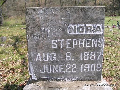 | STEPHENS, Nora | Aug. 6, 1887 | June 22, 1908 | No Data | Headstone Mary Homesley Photo Phyllis Long |