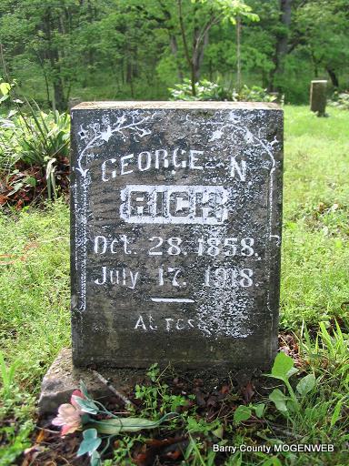 July 17, 1918 | Inscription: "At Rest" - Research Note: Brother to Edward. Son of James and Nancy Rich. His wife was Eunice Sult, daughter of P. A. Sult and Nancy Elizabeth Fife. Her mother is buried here in Cargile Cemetery. - 1860 Census, Township 7 Range 11, Crawford, Illinois - James Rich, age 36, farmer, born NY; Nancy, age 32, born KY; William, age 8, born KY; May, age 8, born KY; Edward, age 6, born KY; Cate, age 4, born KY; George, age 2, born KY; James, age 11 months, born KY. - 1900 Census, Neodesha, Wilson, Kansas - Living with his mother and step-father: John Higgins, head, born Aug. 1822 IL, age 77; Nancy J., wife, born Mar. 1827 KY mother of 9 children, 7 living; Bert, son, born Mar. 1875 IL, married 5 years, age 24, farmer; Minnie, daughter-in-law, born Sept. 1873 KS, age 26, married 5 years, mother of 1 child, living, parents born NC; Harry L., grandson, born Aug. 1897 OK, age 2; George Rich, step-son, born Oct. 1857, age 42, single. - 1910 Census, Neodesha, Wilson, Kansas - George Rich, head, age 57, married 5 years born IL, father born NY, mother KY, farmer; Eunice, wife, age 29, married 5 years, mother of 1 child, living, born OH, father born IN, mother PA; Ansel, daughter, age 1 and 11 months, born KS. | Headstone Mary Homesley Census Photo Phyllis Long |