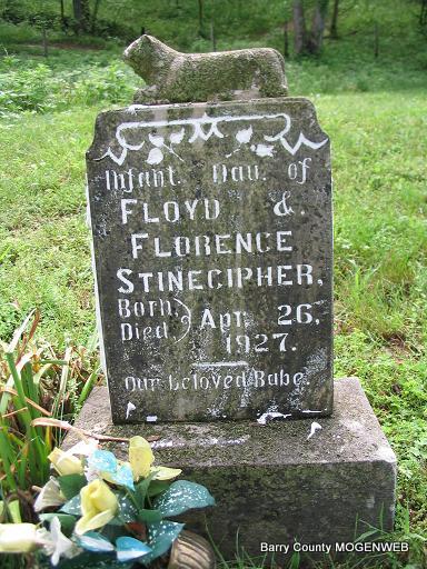 | STINECIPHER, Florence | Apr. 26, 1927 | Apr. 26, 1927 | Inscription: "Infant Dau. of Floyd and Florence Stinecipher, born and died Apr. 26, 1927" - "Our Beloved Babe" | Headstone Mary Homesley Photo Phyllis Long |