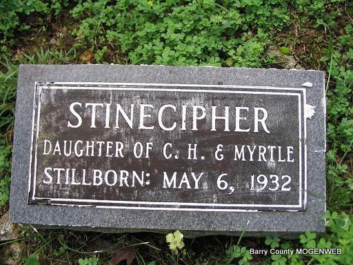 | STINECIPHER, Infant | May 6, 1932 | May 6, 1932 | Inscription: "Dau. of C. H. and Myrtle, May 6, 1932 - Stillborn" | Headstone Mary Homesley Photo Phyllis Long |